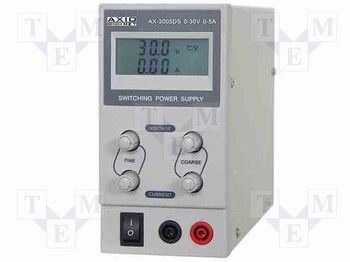 Лабораторен захранващ блок AXIOMET AX-3005DS с регулируемо изходно напрежение 0-30V и изходен ток 0-5A. Стабилизация на напрежението и тока 1%. Размери 80x160x205mm, тегло 1.5kg. Входно напрежение 230VAC. Едновременно отчитане на тока и напрежението, грубо и плавно регулиране, защита от претоварване.